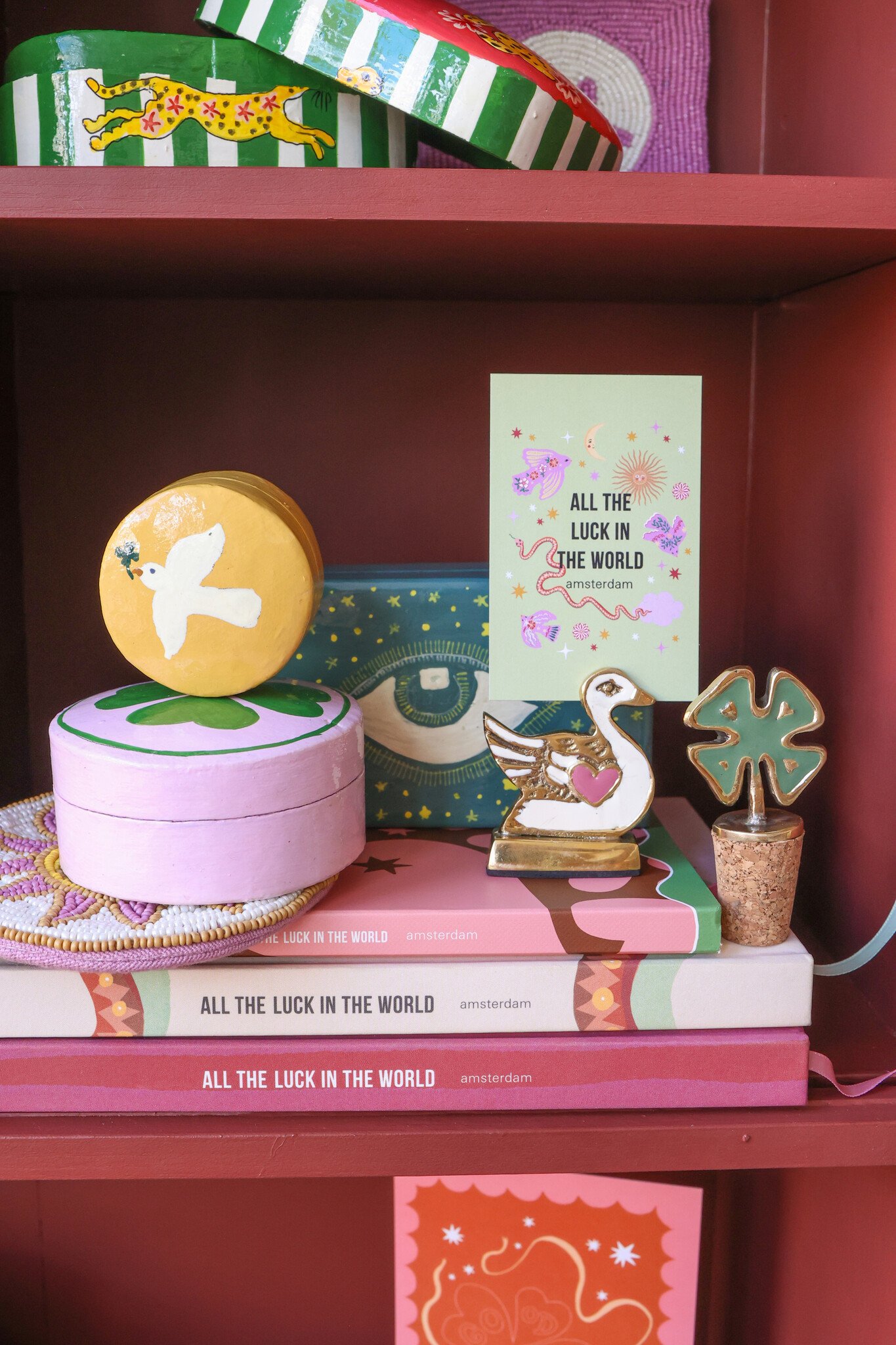 Van brassen haken en deurknoppen tot wijnstoppers en kaarthouders, elk stuk is versierd met leuke ontwerpen zoals yin-yang symbolen en vrolijke smileys. Ook vind je handgeschilderde doosjes en prachtige portemonnees, versierd met schitterende handgeregen kralen – ideaal voor het bewaren van je kleine schatten.